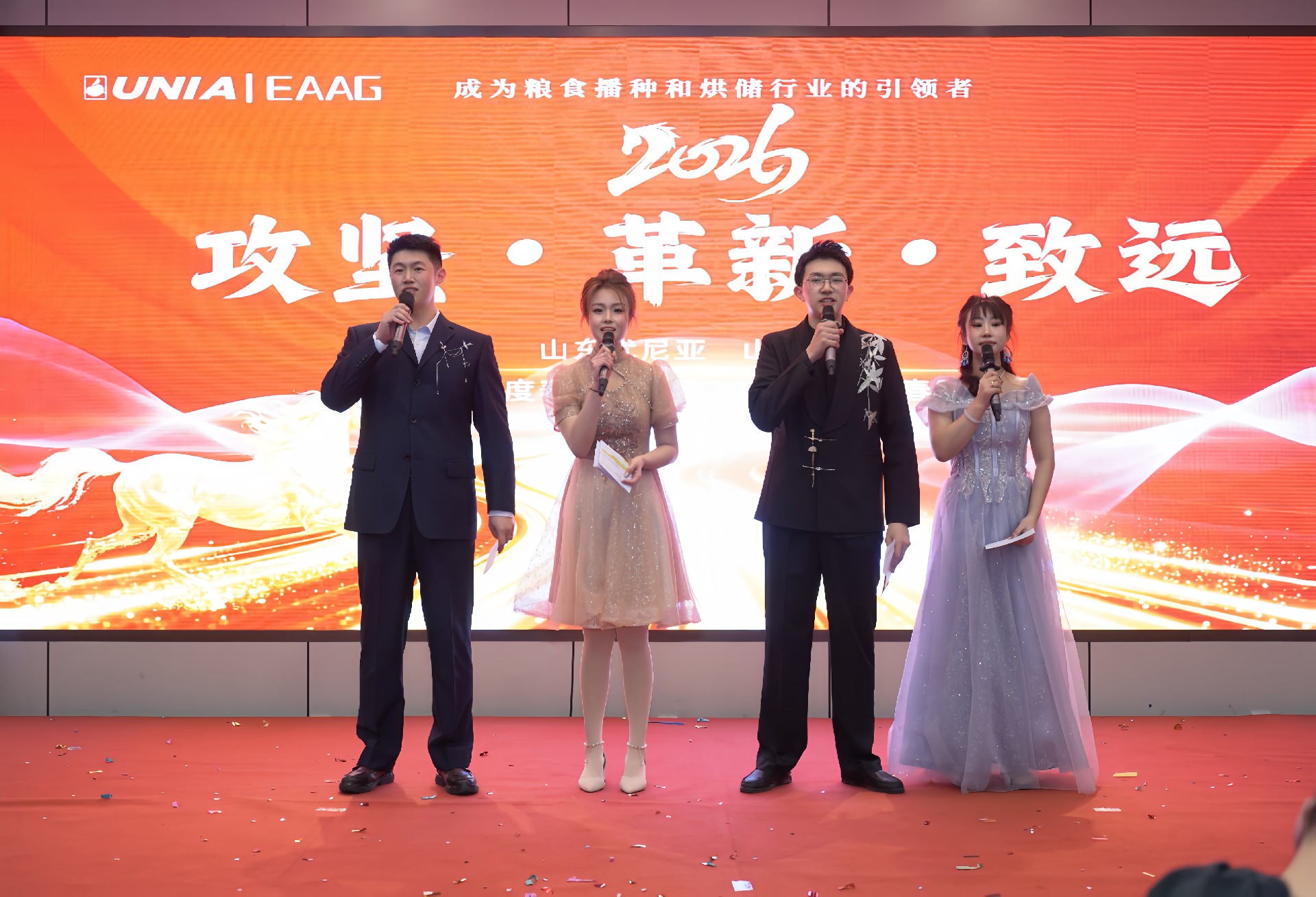 骏马迎春,万象启新。2月10日,山东优尼亚农业机械有限公司“攻坚·革新·致远”2026年会暨2025年度总结表彰大会隆重举行。公司全体员工与家属代表欢聚一堂,共叙奋斗,同绘蓝图。